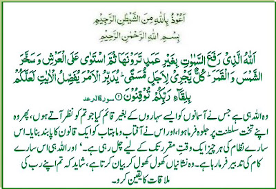 Ayat 2. Allah is He Who raised the heavens without any pillars that you can see. Then, He Istawa (rose above) the Throne (really in a manner that suits His Majesty). He has subjected the sun and the moon (to continue going round)! Each running (its course) for a term appointed. He regulates all affairs, explaining the Ayat (proofs, evidences, verses, lessons, signs, revelations, etc.) in detail, that you may believe with certainty in the meeting with your Lord.